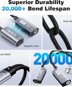 - Magnetic Design for Ultimate Durability: The magnetic USB-C to 3.5mm headphone and charger adapter ensures a solid cable connection, eliminating concerns about cable damage. The braided nylon cable enhances durability and ease of use. A premium aluminum alloy case improves heat dissipation. High-quality connectors provide secure, high-speed data transmission. Its portable size is perfect for travel, home, and office